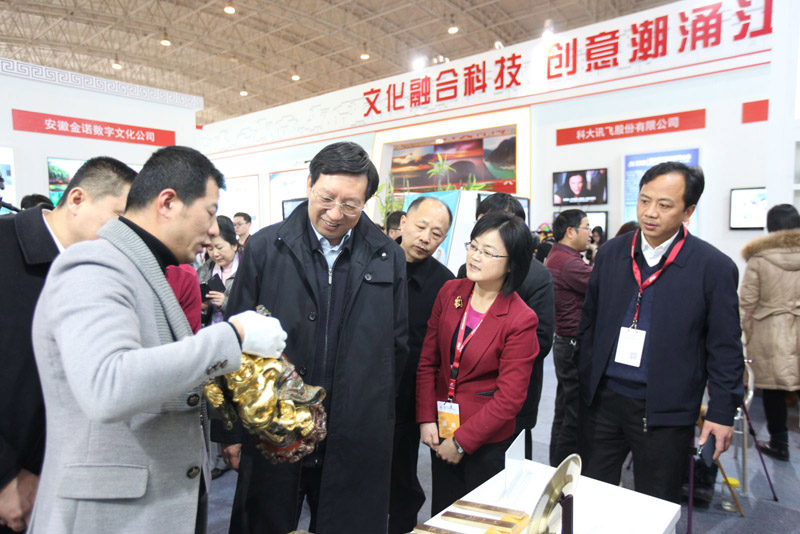 12月11日至14日,在第9届北京国际文化创意产业博览会上,“文化融合科技,创意潮涌江淮”为主题的安徽展馆,以厚重的徽风皖韵文化底蕴和浓郁的现代科技气息,吸引大批参观者。13日上午,省委常委、宣传部长曹征海赴安徽展馆,了解我省参展情况,看望参展企业代表和工作人员,省委宣传部副部长董庆,省文化厅厅长袁华、副厅长周明洁等陪同观展。省政府副秘书长吴行12日参观安徽馆。