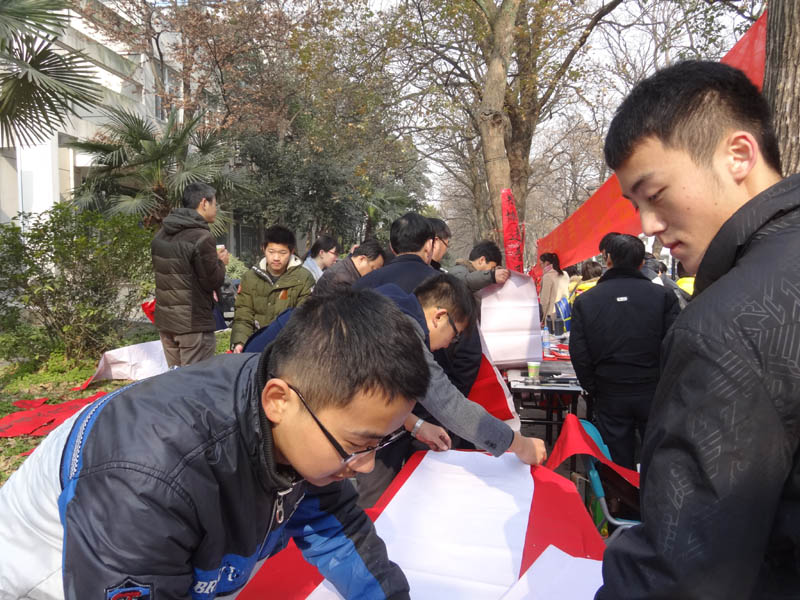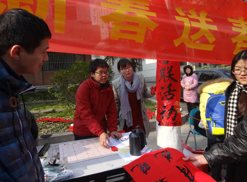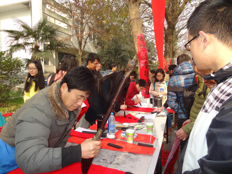 给尊敬的老师、广大教职工和学长学姐们送春联啦!在元旦即将来临之际,由合肥工业大学大学生书画协会组织的每年一度的“喜迎新春 义务送春联”活动,12月25日在合工大屯溪路校区成功举行。本次送春联活动共计送出春联600余副。 昨天上午还不到9点时,在康振民老师和协会会长的带领下,协会的“书法家们”一个个“迫不及待”的在老区开始了持续一天的送春联活动。所有春联均是现场书写的,这样既让老区的师生能够收到春联,又能让他们通过现场观看体会到中国传统文化的魅力,让更多的大学生对书法艺术产生兴趣。本次活动选择圣诞“洋节”这一天,寄载着我们对传统文化的崇高敬意!大学生可以过洋节,但不能一味地崇洋媚外,圣诞节弘扬传统文化有助于广大师生增强文化自信,是以实际行动响应习主席在文艺座谈会上的讲话精神。 春联已经有2000多年的历史,是一种独特的民族文学形式。它以工整、对偶、简洁、精巧的文字描绘时代背景,抒发美好愿望,深受人们的喜爱。一副副春联寄托了我们大学生书画协会对全校师生最温暖的祝福,祝愿全校师生在新的一年里能都平平安安,事事顺心,红红火火。