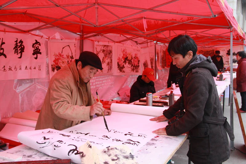 据悉,双岗街助残队长期致力于帮残助残,带着残疾人走出家门,融入社会。去年已经成功举办了第一届助残过大年、百名残友踏青、助残一日游等助残活动。近日,为了再次让更多的残疾人提前过一个欢乐年,双岗助残队联合安徽书画网公益事业部,组织数十位名书画家,在合肥美游城时尚生活广场连续进行了四天的义卖。爱心书画家们冒着严冬、顶着寒风为爱挥毫。合肥美游城时尚生活广场总经理程善锐得知后,被这一幕幕爱心所感动,立即表示,将为第二届助残过大年免费提供场地与就餐。