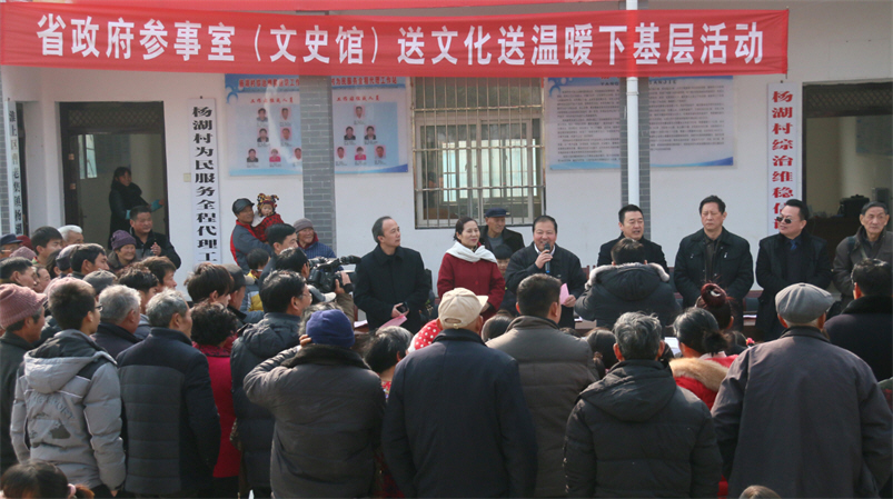 到了,到了!终于到了。2月11日,正值农历腊月二十三,家家户户过小年之际,省参事室副主任、文史馆常务副馆长刘江颍,副巡视员周素萍,副馆长张杰,文史馆馆员萧承震、沈力,特约研究员张维瑛、方中传以及机关部分同志一行一大早就从合肥赴蚌埠市开展看望慰问和送文化下基层活动。 来了,来了!可算盼来了。蚌埠市淮上区曹老集镇杨湖村的村民,早早便等候在村委会,男女老少,欢呼雀跃,期盼着新年之禧。 村委会前不大的广场上,人头攒动,人潮人涌。在进行简单的慰问品发放仪式之后,随行的书画家们便开始挥毫泼墨,把一幅幅红彤彤象征着红红火火的日子的春联送到老百姓手中,把一句句新年的祝福随着墨香送进千家万户,把一份份真情传递到老百姓的心头。两个多小时的时间里,书画家们顾不上喝上一口热茶,甚至顾不上直一直腰,顶着寒风不停地书写,尽最大能力满足老百姓的要求。大家一致表示,看着村民一张张充满欢喜的脸,身体再累心也甜。 期间,刘江颍副主任还分别看望慰问了馆员张乃田、郭学东和挂职干部邾根斌,关切他们的学习、工作和生活情况,把组织的温暖和关怀送到他们的心坎上。 在淮上区活动中,区委书记洪斌,区长冯中元,区政协主席、宣传部长钱厉等领导亲切看望了馆员、研究员及机关的同志。钱主席还对这次活动“点赞”,并赋诗、词各一首。