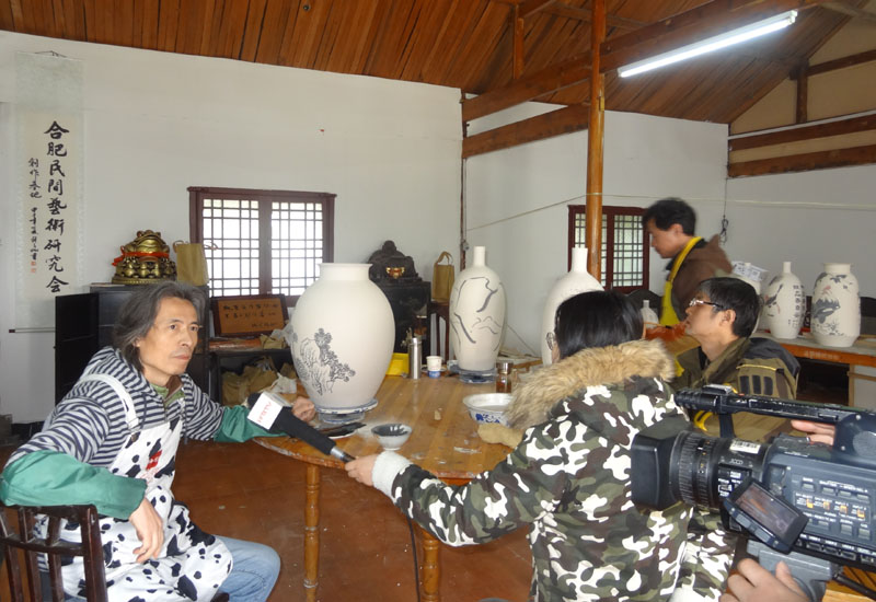 2015年3月21日,风和日丽,春光烂漫,正是人们走进自然、休闲游玩的大好时光。上午8点多,徽瓷文化园、安徽书画网陶瓷艺术中心迎来了几位实力派中青年书画家,他们分别是合肥市书画院副院长、著名人物画家郑天伦,著名画家、中国美协会员申皖如、陶小平、张勇、沈绍平等。 几位书画家是由陶小平组织邀请的,他们在何泽厚、孙洪廷的陪同下参观了园区和陶瓷生产、烧制车间,园区优美的环境和清新的空气令艺术家们赞叹不已,同时能容纳一百多人玩陶艺的车间也颇受艺术家们好评。 当天上午,适逢合肥电视台前来采访,记者先后采访了几位书画家和“玩泥巴”的大学生,大家对徽瓷文化园都给予很高评价;书画家们认为,徽瓷文化园开展陶瓷艺术和手工陶艺活动,不仅为书画家提供了一个良好的画瓷平台,也为市民提供了一个新的娱乐休闲方式;对书画家来说,在这里画陶瓷不仅节约了经济成本,还节约了宝贵的时间,这对发展安徽陶瓷艺术必将起到很大的促进作用。
