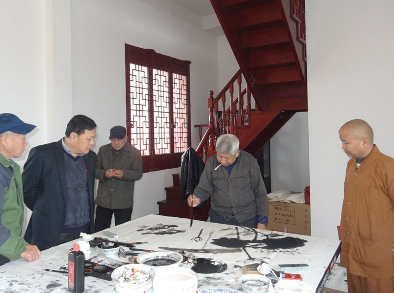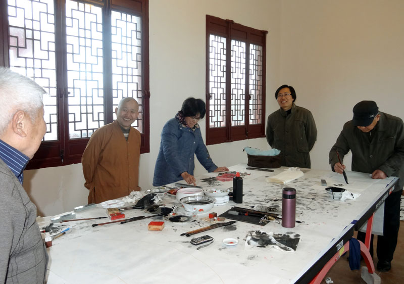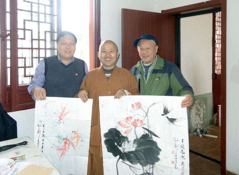 冬去春来,万物复苏。春日的合肥和江南一样处于“清明时节雨纷纷”多雨季节,乍暖还寒。自古以来,不论是文人雅士还是普通百姓,都有清明祭祖、踏青的习俗。鼎鼎大名的《兰亭集序》就是王羲之和一些文人雅士上巳节从事禊的活动时,书圣现场挥毫,一气呵成的名篇。 4月6日,杨国华、孙新立、郑石桥、王文秀等艺术家和书画爱好者一行九人去巢湖中庙烧香拜佛、采风作画。也许是5日清明下了一天,雨神稍作休息;也许是大家风雨无阻的诚心感动了菩萨。天公作美,直到大家顺利到达并饱游了中庙胜景后,天上才开始落下淅淅沥沥的小雨。雨中的巢湖别有一番风韵,空气倍加清新;庙里正在盛开的牡丹花在雨中显得分外娇媚。书画家们被眼前的美景所感染,纷纷拿起毛笔,即兴挥毫。 中庙主持界全法师不仅是一位佛学知识渊博的高僧,也是一位能写能画的书画艺术家。他热情欢迎大家并与艺术家们广泛交流。老画家郑石桥记忆力超强,他主动向大家介绍清明三节(即寒食、清明、上巳)的起源与演变。寒食,起源于远古取火用火的礼俗,春秋战国时期介子推的故事为它注入了更多文化内涵;由于寒食节与清明日子接近,又是民间禁火扫墓的日子,到唐代就与清明就合二为一了。上巳,是远古人们用洗浴来“祓除不祥”的“修禊”的日子,到春秋时就演变成了水边休息娱乐的日子。随着习俗的流传,后来也与清明、寒食融合,合并为今天的清明节。