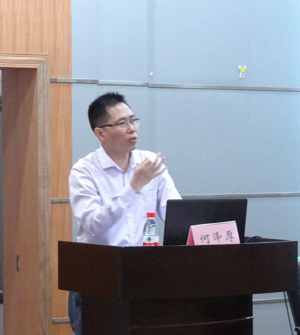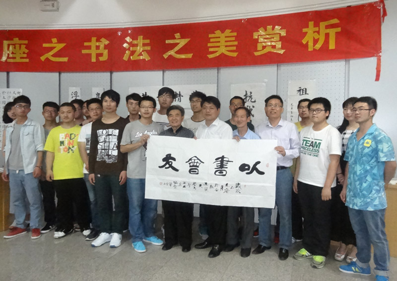 2015年5月10日晚,在中国书协安徽省考级中心包河工作站支持下,校团委、校大学生书画俱乐部组织的“大家讲堂--书法美之赏析”在我校翡翠湖校区图书馆小报告厅举行。本次讲座由知名史论美评家主讲,校团委书记陈文恩参加活动并讲话。受邀前来指导的还有著名书法家荣华堂、中国书协安徽省考级中心包河工作站负责人姜家臣等。 何泽厚老师从什么是书法,书法发展简史,书法的欣赏标准等方面对书法美的欣赏进行了详尽的讲解,并以著名书法家李训华老先生的书法进行赏析,提出了自己独到的见解与思考。何泽厚引经据典,分析到位,现场的同学们仔细聆听,纷纷表示,何泽厚老师的讲解专业而生动,详细而精妙,让人受益匪浅。本次讲座是何泽厚老师弘扬传统书画艺术高校巡回讲的第五站。 其后,嘉宾们分别对同学们带来的书法作品进行了仔细点评,指导同学们注意章法、结体、笔法、墨法在书写过程中的具体运用。最后,荣华堂老师进行现场书法创作演示,并为我校大学生书画俱乐部题写“以书会友”,以习近平总书记寄语青年“勤学、修德、明辨、笃实”八字真经相赠,祝贺学校建校70周年。(汪朝杰)