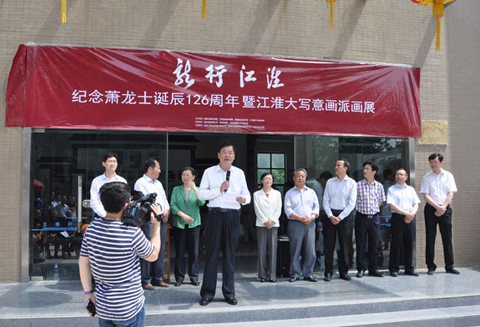5月16日上午,纪念萧龙士诞辰126周年江淮大写意画派展览在新安书画大厦隆重举行。安徽省政府参事室、安徽省文史研究馆、安徽日报报业集团、中共宿州市委宣传部等有关领导参加了开幕式。 参加活动的著名书画家有:原省书协主席、著名书法家张良勋,著名美术史论家郭因,原安徽日报美编主任、著名画家龚艺岚,原省政协常委、省书协副主席王家琰,原省美协主席章飚、副主席朱秀坤,原合肥市人大副主任、著名书画家方明,萧龙士研究会会长萧承震,萧龙士研究会副会长丁培生、萧承蔼、王少石、何瀚、沈力等;来自宿州家乡的有:萧龙士艺术馆名誉馆长、萧县书法家协会主席李乐武,省书法家协会理事、宿州市书法家协会副主席兼秘书长朱绍俭等。本次展览得到了社会各界的大力支持,著名大写意画家郑正说,“这是件大好事,感谢安徽日报报业集团等单位主办这次纪念活动,我支持,我要去参加画展”。老人写了“龙行江淮”—为纪念萧龙士诞辰126周年画展题”。