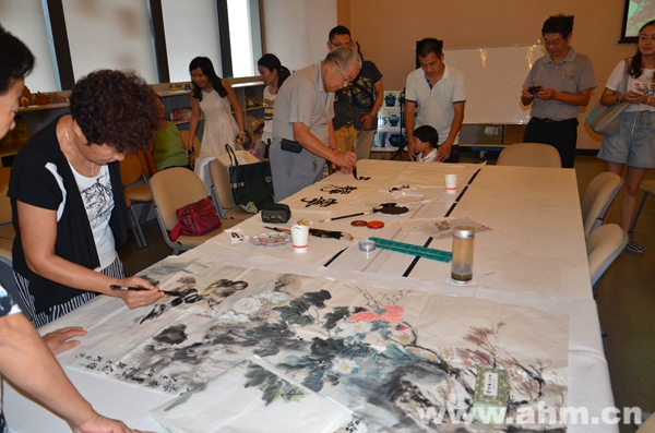 开展当日,十几位安博之友书画爱好者们还在此举办了座谈会,他们中有多位已是年逾七八旬的老人,他们亲身述说了战争年代的记忆,表达出对侵略者的憎恨和对中华民族崛起振兴的强烈愿望。大家还一起探讨了如何发挥书画艺术作品的独特魅力,达到影响感染大众的目的。随后,与会者们进行了笔会活动,以纪念中华民族这一伟大的历史纪念日。