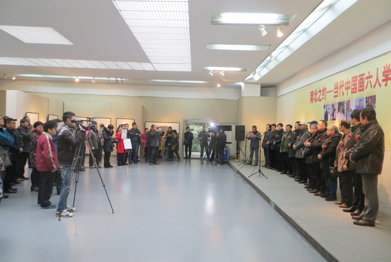 今天上午11时,由湖南省画院、山东省画院、安徽省书画院、黑龙江省画院主办,中国国家画院师生联谊中心、合肥-久留米友好美术馆承办,青州画廊联盟、九州画院、中国山水画创作院山东分院、安徽省广德矿产品公司协办,得到了合肥市美术家协会、青州画廊协会、雅昌艺术网、卓克艺术网、美术报、中国书画报、央视111收藏频道、山东商报、潍坊日报、潍坊电视台画都风向标频道大力支持的“南北之约——当代中国画六人学术展”在合肥-久留米友好美术馆开幕了。