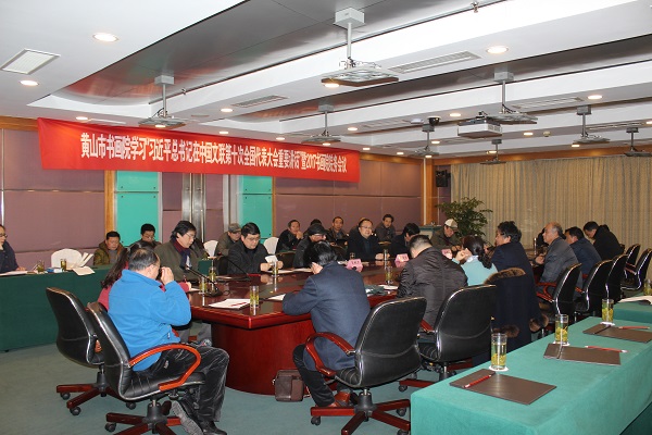 2017年1月5日,黄山市书画院在黄山国际大酒店召开学习贯彻“习近平总书记在中国文联第十次全国代表大会开幕式上发表的重要讲话精神”暨院务会议。市文化委主任胡建斌、党组成员吴鹏凯及人民艺术杂志总编汪明华出席会议。