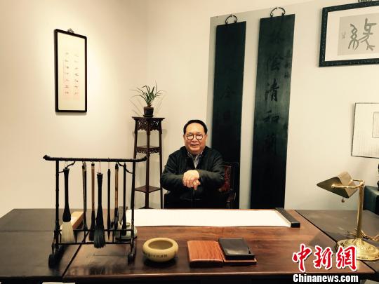 书法篆刻家陆康坐在展厅中。 胡建君 摄