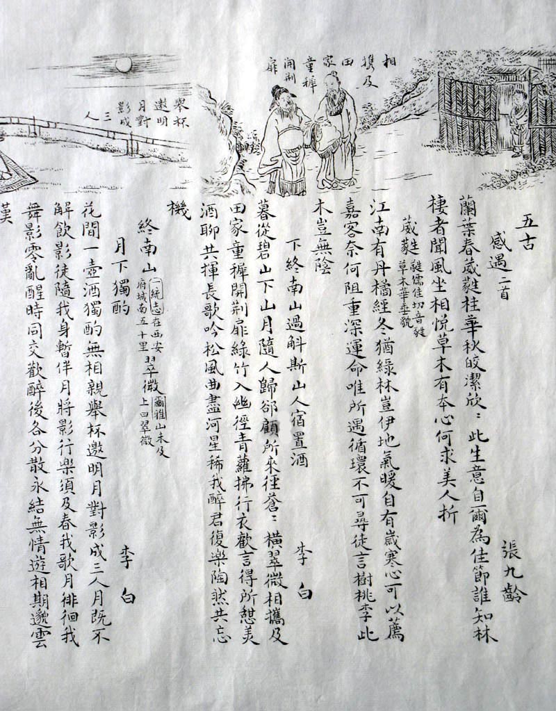 余幼既喜诗、书、画,喜结书画先辈,仰慕大德高贤,谙聆天然之机,孜孜以求几十年,虽未见合于时下,确已筑基于坚牢。2008年春,得幸识契弟实余明师之当代大贤高隐吕宗凯先生,常予台正,赞余之可观处,启余之不足处。余豁然开朗,艺境大进。循缮录《绘图唐诗三百首(附注释)》、《论语》、《老子》、《金刚经》、《绘图孙子兵法》等长篇手卷,字画艺长,诚乃一大享受。