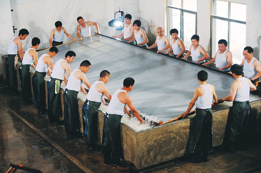 抄帘、跨转、抬手、弯腰、回身、落下……5月29日,在泾县中国宣纸股份公司宣纸生产车间水泥纸槽边,18名捞纸工人动作整齐划一,被誉为“宣纸之王”的特大型宣纸——“千禧宣”在这里恢复抄制,这也是该厂时隔15年后再次成功捞制特大型宣纸。图1为18名熟练捞纸工人合作捞纸。