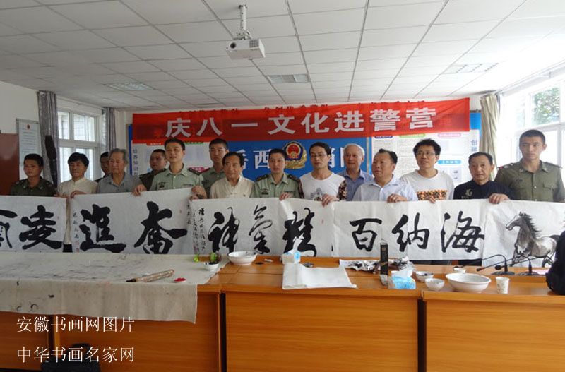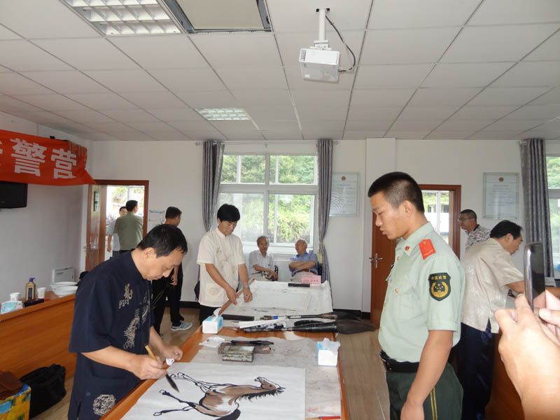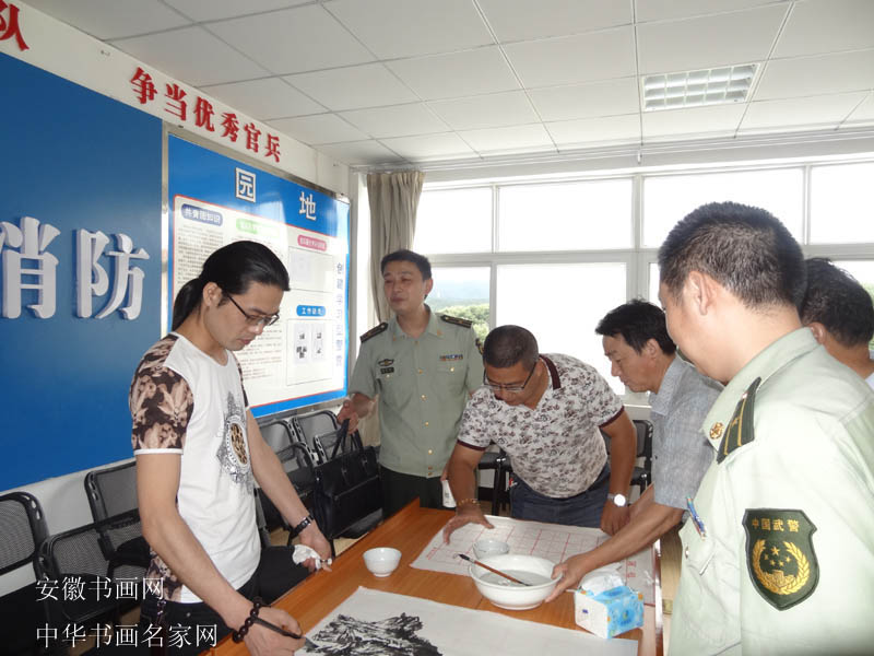 7月24日,“八一”建军节来临之际,受岳西爱心公益联盟的邀请,中国公益书画院9位艺术家走进岳西县消防大队,开展“文化进警营”活动。参加活动的有:全国十大书法家薛祥林大校,中华书画名家网总编、公益书画院执行秘书长何泽厚,岳西县宣传部副部长黄啸虎,公益书画院院长陆利兵,安徽翰墨艺术书画院常务副院长盛鲁平,“大笔王”康振民,中国国画院华东分院副院长梁大明及知名老艺术家杭献清、程端方等。 24日早上八点多,艺术家们不辞辛劳,在中国公益网负责人汪国保的带领下来到岳西县消防大队,岳西县消防大队教导员邦春华、大队长佘阿三代表全体官兵热烈欢迎。书画家们获知该消防大队2013年荣获“全国爱民模范集体”光荣称号后,主动把原计划两个小时的笔会延长了一个小时。 中国公益网书画院院长陆利兵表示,通过走进警营开展慰问活动,警营的特殊氛围深深感染了我们,激发了我们的创作灵感。希望我们有机会常来交流,为丰富战士们的精神文化生活、提升战士们文化素养,尽一份绵薄之力!