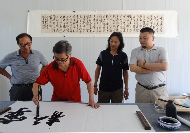 张有炳会长开笔,右2为著名山水画家、副会长赵光辉,右1为著名书画家王文林