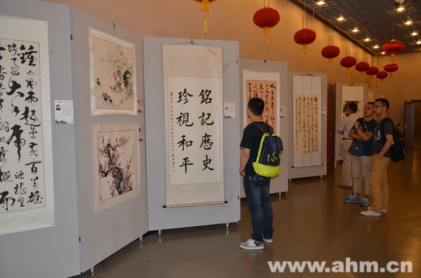 为纪念抗日战争胜利70周年,8月22日,《安博之友书画作品特展》在安徽博物院新馆二楼多媒体教室开展。安博之友书画爱好者们为本次展览精心创作了多幅佳作,从书画作品的内容来看,有描绘祖国锦绣河山的山水画,有祝愿祖国繁荣昌盛的花卉画,更有充满昂扬激情的书法诗词,无不充分体现出书画家们不忘历史的崇高热情,展现了爱国情怀。