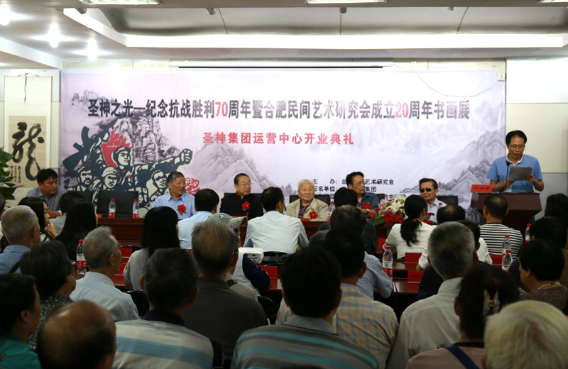 为纪念抗战胜利70周年,弘扬传统文化,在中秋、国庆双节即将来临之际,由合肥民间艺术研究会主办,中国公益网、中华书画名家网协办,中国圣神集团冠名承办的“圣神之光—合肥民间艺术研究会成立20周年暨抗战胜利70周年书画展”9月13日上午在圣神集团合肥运营中心隆重举行。开幕式上同时举行了圣神集团开业典礼。