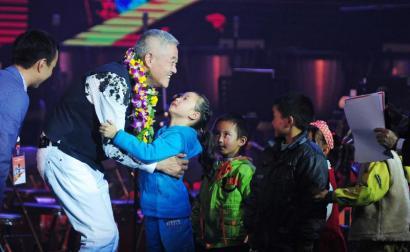 “芦山本山小学”今年9月正式投用,并招收了首批13名一年级学生。25日晚,其中11名孩子也来到了义演现场。他们在校长廖四华和音乐老师张玲的带领下登上舞台,然后齐声高喊“赵爷爷”,将赵本山从幕后请出。