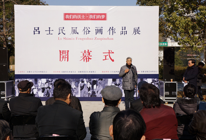 为大力宣传深入基层扎根人民活动中涌现出的优秀作品和优秀文艺家,12月18日上午安徽省文学艺术界联合会在合肥徽园举办“艺术为人民--吕士民风俗画作品展”开幕式。省文联党组书记、书记处第一书记陈田出席开幕式并宣布画展开幕,省文联主席、书记处书记吴雪,省美协主席张松,著名画家吕士民分别在开幕式上致辞,省文联原副巡视员江枫、著名画家王涛及省美协、省设计协部分主席团成员,省暨合肥市有关新闻媒体记者及社会各界人士约150人参加了开幕式。