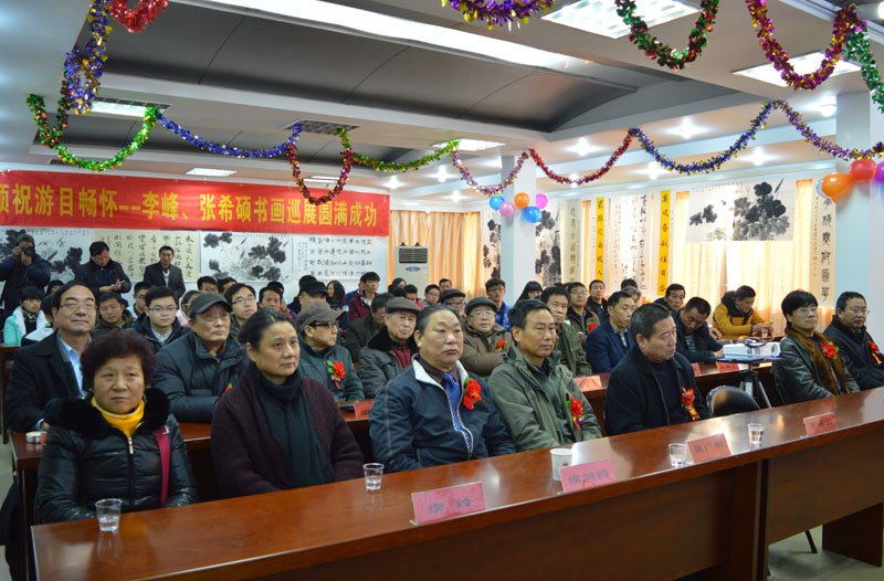 为纪念毛主席诞辰122周年,由中国水墨画艺术研究院、安徽书画网主办,中国圣神集团协办的“游目畅怀--李峰、张希硕书画巡展•合肥站”12月26日在合肥圣神艺术馆隆重举行。安徽省政府原副秘书长、省老年书画联谊会会长陈树良,著名书法家、原合肥市文联主席李训华,安徽省政府文史研究馆馆员、国家一级美术师石里溪,省直老年书画联谊会常务副会长荣华堂,圣神集团董事长莫善峰,合肥好人宋国强,安徽省美协办公室主任、著名工笔花鸟画家李玲,中国注册美术家协会会员温宗良,中国注册书法家协会会员侯鸿钧,中注册书法家协会会员、翰墨艺术书画院常务副院长盛鲁平,知名书画家康振民、吴广明、杨国华、孙新立、杭献清、梁大明、王平、任启俊、杨硕鹏、杨玉能、祖鹏飞、曹宝森、赵晓嗣等出席活动并参观展览。陈树良会长、石里溪院长分别讲话,李峰致答谢词。开幕式由安徽书画网总编何泽厚主持。
