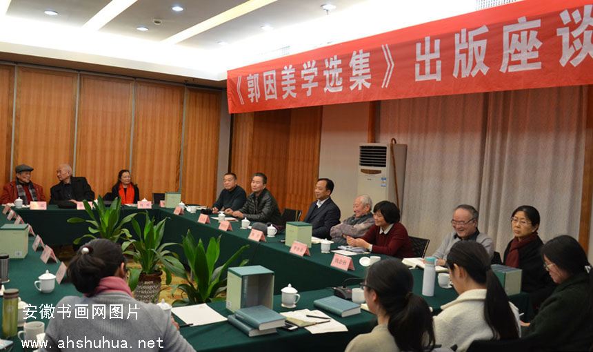 座谈会由李春荣院长主持。美学界、艺术界专家、出版社代表及有关媒体参加了《郭因美学选集》的座谈研讨,老中青三代学者汇聚一堂。本省美学及相关学科知名专家许有为、何迈、尤传楷、陈祥明、钱念孙、王长安,《中国文化报》驻安徽记者站站长乔国良、画家童凤莉、张继平等相继发言。与会专家认为,《郭因美学选集》的出版,是美学界的一件大事;作为美学界代表性人物,对其著述的梳理和集结,也是对当代美学发展历程的一种回顾。许有为以“文化班头、学界祭酒”盛赞郭因在美学上的成就,认为郭老在学术上不拘一墟、专而能博。何迈回顾了上世纪五十年代、诸多美学大家如朱光潜、蒋孔阳参与其中的“美学大辩论”,他认为郭因在那场大辩论中提出了独立的见解,把美学从书斋推向了时代与生活;“大文化”“大美学”等观念,扩大了美学的视野,拓宽了美学研究的道路,解决了美学的研究对象、发展方向问题。尤传楷从城市建设的角度评价了郭因的美学思想,他认为,郭老提出的人与自然、人与人、人自身三大和谐思想既深深扎根传统文化哲学,又有很强的实践性品质,对于现代城市发展是一种科学有益的理念。陈祥明提出,郭因作为富有影响的美学评论家,是“新徽派美术”最早的研究者,扩大了安徽当代美术的影响力。钱念孙认为,郭因在学术研究中真正做到了文史哲融会贯通,除美学之外,在哲学、文学、绘画以至园林学上皆有独特的思考和不俗的成绩,依于学、游于艺、行于事,由内而外、由学术而艺术而至解决现实问题,形成了一个个性化而丰富多维的系统;在美学阐述上形成了独具风格的散文化语体,理性与诗意交融,学术高度与人生境界化而为一。王长安提出,郭因在50年代就提出了“绿色美学”的理念,提出了“三大和谐”的思想,从今天的经济社会发展现实来看,这是一种远见卓识;当前“以人为本”、“和谐发展”、“科学发展”的观念,正契合了郭老的美学思想。乔国良谈到,郭老在为学中始终灌注着人文关怀和对现实政治社会的关切,有一种公共知识分子的担当;做学术研究是件寂寞枯燥的事,郭老在学术上矢志不渝、甘坐冷板凳、不为外在喧哗所扰,这种精神在当下值得我们学习,我们今天尤其需要郭老这样的“学术种子”。