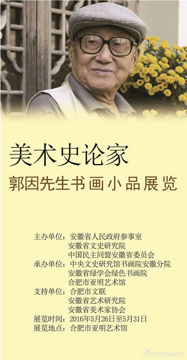 5月26日,由安徽省人民政府参事室、安徽省文史研究院、中国民主同盟安徽省委员会联合主办,中央文史研究馆书画院安徽分院、安徽省绿学会绿色书画院、合肥市亚明艺术馆承办的“满目青山夕照明”郭因个展在亚明艺术馆隆重举行。 著名美学家郭因先生是一位学富五车、满腹经纶的大学者。早在上世纪八十年代,他的《艺廊思絮》、《中国绘画美学史稿》等著作出版,以前瞻的思维、新锐的视角、清新的语言,将在极左思潮猖獗下萌生的新思想的闪烁火花点燃,给一大批彷徨的读者带来了温暖的阳光和清新的空气! 郭因先生是一位饱经风霜的知识分子,早年参加革命,加入民盟,还是一位老游击队员。一辈子忧国忧民、笔耕不辍,已出版发表了数百万字的著作,为新中国社会主义美学大厦的建设作出了甚具个人特色的贡献。鲜为人知的是,他还是一位学者型的个性鲜明的书画家,近年,不断有书画作品问世,几乎达到了“不鸣则已、一鸣惊人”令人惊叹的地步。 郭因先生作画经常是片纸,秃笔,信手勾勒渲染。作简笔山水,寥寥数笔,韵味无穷。郭因先生对中国绘画史论烂熟于心,谈及历代画家的风格如数家珍,有深厚素养的博学之士,落笔自然不同凡响。 郭老又是典型的“学者书家”,字体俊朗秀逸,已达到“炉火纯青”的境界。 我最欣赏的是郭因先生每幅画中的题辞,可以说,这在中国画坛可谓独领风骚。曾有一山水画,秃松一株、危岩一角,松下岩边,一座荒庙,他题道:“画个松下岩边破庙给心住”,又画有幽谷春兰一幅,题云:“兰生幽谷吐幽香,谢绝蜜蜂为吾忙,自落自开自欣赏,无心挤入娱乐场。”如此等等,不一而足,由此不难窥知其高尚的胸襟及其忧世的深意。 郭因先生还擅长诗词曲赋,他的《红楼人物咏》脍炙人口,广为流传,可以说,他在文学艺术方面的修养是全面而又厚重的。他显然已达到“腹有诗书气自华”的佳境。这样一位全面继承与弘扬祖国优秀民族文化传统的可敬老人,一位坚守“人民旗帜”的文艺老战士,他的书画作品,都是抒写在宣纸上的抒情诗,令人动情。 总之,郭因先生书画作品的艺术成就是别具一格的,他真正做到了从平凡的题材中提炼出有积极意义的主题,加强了作品的思想容量,以简洁的形象,唤起读者丰富的联想,达到了言简意赅、言有尽而意无穷的艺术境界! 郭因先生书画创作成就彰显出的个案,又一次说明了古往今来画家行万里路,读万卷书,加强自身全面文化修养的极端重要性,这也恰是当今许多画家较为欠缺的。要想攀登艺术高峰,必须加强自身文化素养的提升和积累,这才能永葆艺术之树常青,创作出无愧于时代和人民的佳作,这就是千万个老一辈的“郭因现象” 对我们最有现实意义的启迪和激励。(文/出自于安徽省美协主席 章颷) 展览前一天,主办方还在合肥市稻香楼举行了“《郭因文存》出版座谈会”。本次展览得到了合肥市文联、安徽省艺术研究院、安徽省美术家协会等单位大力支持。