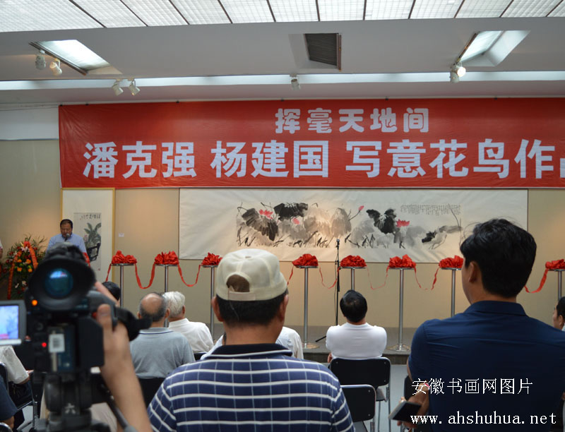 2016年8月20日上午,由安徽省参事室、文史馆、合肥市文联主办,合肥市书画院承办,合肥-久留米友好美术馆协办的“潘克强 杨建国——写意花鸟作品展”在久留米美术馆举行。安徽省文史馆常务副馆长刘江颖致辞。合肥市政协书画院院长董昭礼、原省美协常务副主席林存安、省美协主席杨国新等书画界名流出席活动并观展,著名画家郭公达、石里溪、朱松发、荆涛、班羚、徐若鸿、李碧霞、萧承震、荣华堂、贾德福等参加了开幕式。 潘克强,1943年生于安徽省临泉县。1965年毕业于安徽省艺术学院美术系。现任安徽省文史研究馆馆员,合肥书画院专业画家,巢湖市美术家协会名誉主席。 潘克强作品立足于中国大写意以笔墨神韵为中心的自由书写精神,融汇西洋绘画的写实观念和造型能力。构图简练、造型夸张,在高度的抽象和概括中勾画形神兼备的花鸟形象;落笔如歌、一气呵成,以行云流水之势谱写神闲意定的自然之趣;挥毫泼墨、酣畅淋漓,用自由不羁的精神创造宏大格局和深远意境。 杨建国,字墨人,号陋室斋主,出生于安徽亳州。1978年入伍,1982年就读于解放军艺术学院美术系。现为:皖新传媒书画院副院长,安徽省美术家协会会员,合肥市书画院院外画家。美术作品多次入选全国、省、市书画大展并获奖。