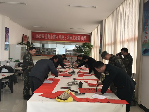 根据黄山市文化委的部署,2017年1月13日下午2点,黄山市市书画院副院长董建率8位书画家们来到96175部队,在部队图书馆举行“送春联进军营”活动,给部队官兵送去新春祝福。活动持续近3个小时,创作春联300余幅。继到部队送春联之后的14、15日两天,书画院又到休宁充头村和歙县长陔胡埠村送春联下乡,为农民送春联数百幅。