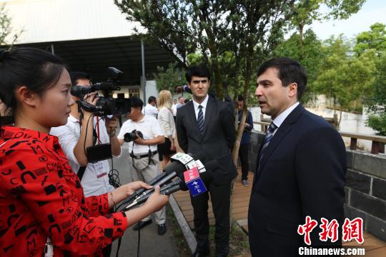 塔吉克斯坦驻华大使达夫拉特佐达接受媒体采访。 施亚磊 摄