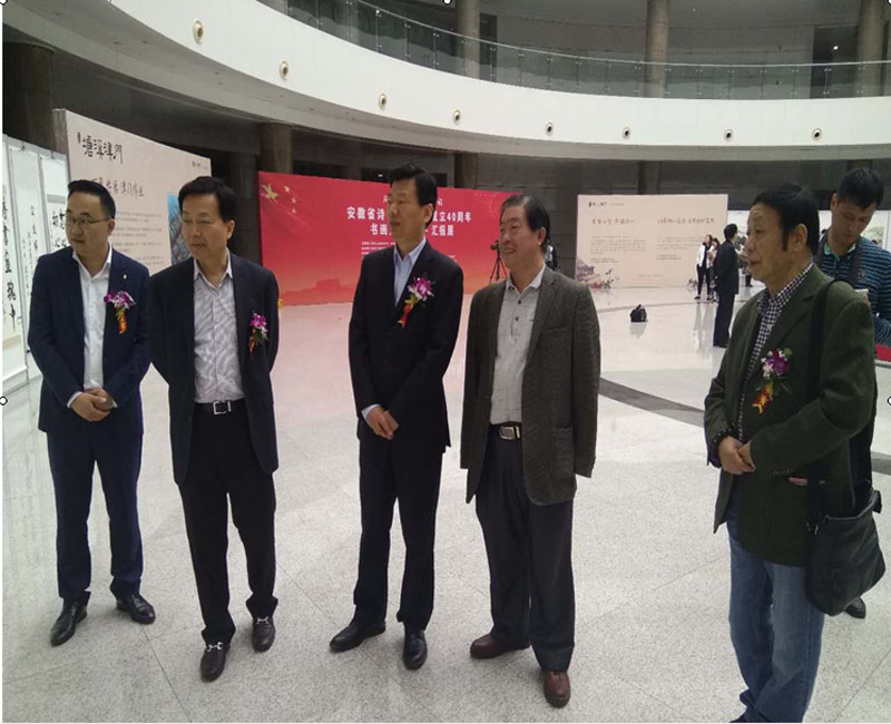 出席开幕式并在主席台上就位的领导和嘉宾有:安徽省人大原副主任郭万清,安徽省政协原常务副主席秦德文,中共合肥市委常委、市委宣传部部长钟俊杰,合肥市政协原主席、安徽省书法家协会副主席、合肥市政协书画院院长、著名书法家董昭礼,安徽省文联副主席、安徽省中国画学会会长、安徽省美术家协会原主席、著名画家张松,中共合肥市委原常委、合肥市人大副主任、安徽省美术家协会副主席、著名书画家林存安,安徽省文史馆副馆长张杰,安徽省美术家协会顾问、全国著名画家郭公达,安徽艺术学院教授、著名画家李碧霞,安徽省政协法制委原主任、著名书法家胡章佩,安徽省诗书画研究会创会副会长、安徽省政协原常委、著名书画家王家琰,安徽省诗书画研究会创会副会长、著名书画家、篆刻艺术家杨国华,安徽省人民政府参事室参事、安徽省书法家协会副主席、著名书法家、评论家余国松,安徽省文史研究馆副馆长、著名篆刻书法家张旭华,文一地产集团副总裁、滨江置业负责人夏明军。