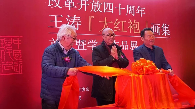 2018年12月9日,庆祝改革开放四十周年王涛《大红袍》画集首发暨学术作品展在合肥市中国书法大厦隆重举行。安徽省委常委、宣传部长虞爱华,安徽省政协秘书长、党组成员车敦安,安徽省文联党组书记何颖,省文联主席、中国书协理事吴雪,中国画学会副会长、著名美术理论家孙克、杜滋龄、刘国辉等领导和嘉宾500余人出席。展览汇集了王涛先生四十年来近百幅精品,多幅作品为首次在安徽省内公开展出。 王涛现任中国画学会副会长、中国国家画院研究员、安徽省书画院名誉院长,国家一级美术师,享受国务院特殊津贴。人民美术出版社“大红袍”系列是中国近现代美术史的文献丛书。2018年出版发行的《中国近现代名家画集——王涛》,共收录涵盖王涛40年来创作的代表作品160余幅。汲取和发扬了传统写意精神,思考和探索了当代写意人物画的笔墨语言,体现了画家前瞻性的美术引领和艺术担当。 本次活动是对王涛几十年美术创作的回顾,既是安徽美术界的一大盛事,也是对王涛艺术成就的肯定。在开幕式上,安徽省文联主席吴雪表示:“王涛先生将 ‘大红袍’首发式选择在故乡合肥,体现了他对家乡情怀,对安徽美术的期待,是一个有情怀、有担当的艺术家。” 在当天举办的学术作品展研讨会上,中国画学会常务副会长兼秘书长孙克、著名美术评论家杜滋龄、刘国辉、林木、刘墨、邓福星、刘继潮、陈祥明等,对王涛当代写意人物画的思考和探索进行了精彩的点评。孙克认为,王涛的作品极具独特个性,更在中国画人物画中独树一帜,作品注重诗意的内涵和精神,也善于运用色彩,“他通过作品形式和造型表达出了时代精神。” 本次学术作品展以4个阶段呈现,囊括王涛1978至2018的作品,也提供和启发青年一代艺术家对当代写意人物画的思考和探索。 王涛说,人美近现代名家“大红袍”的出版,是对其创作的肯定和检阅。应该感谢这个时代,给了艺术家宽松的创作环境,更应该感恩新安文化这片厚土的滋润,孕育了自己的艺术理念。好的艺术家在寂寞的自我修为中慢慢地成长,乃至茁壮,郁郁成荫。他说,二十一世纪的当代画家,面对中国画的传承和发展,一个“新”字将是“笔墨当随时代”的创作准则。