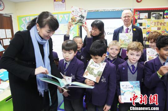 14日,中国凤凰出版传媒集团代表俞慧洵(左)在“中华文化走进英国课堂”活动中,向英国小朋友们讲述中文图书中的故事。 张平 摄