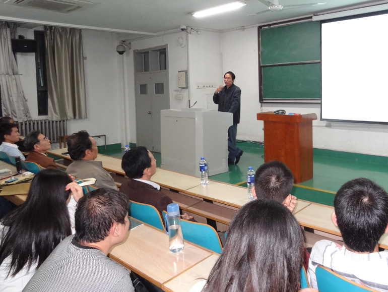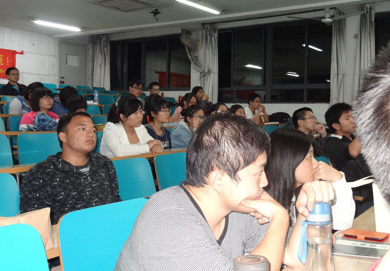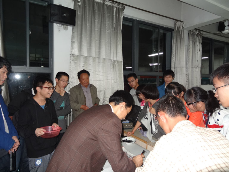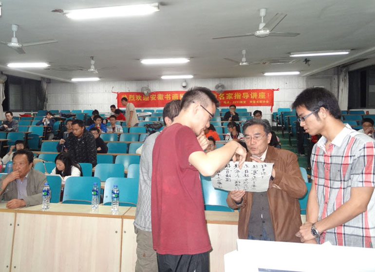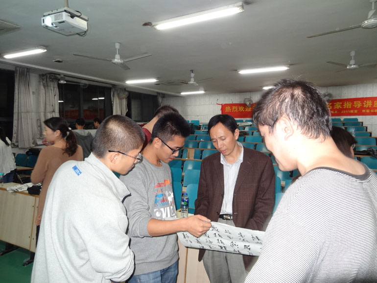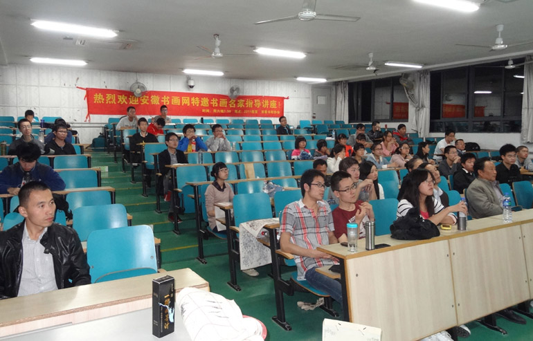 众所周知,中国科学技术大学是中国科学院所属的一所以前沿科学和高新技术为主的高等学府,虽然兼有特色管理和人文学科,但人文学子所占学生的比例显然很小,其中爱好书画艺术的群体更不能说很多。据该校双馨书画协会主席连少鹏介绍,双馨书画协会的会员只有一百名左右,今年招新比较成功,新生会员大概三十多名。由于高年级同学的学习任务重,所以老会员很少参加书画活动,为了把该讲座开展起来,他们抽时间做了几张海报张贴于校园内,现场竟然来了四十多人,对此,他们颇为满意。值得一提的是,其中有几名是中科大和安徽大学的老师,他们是看到海报之后,因为感兴趣而来参加的。